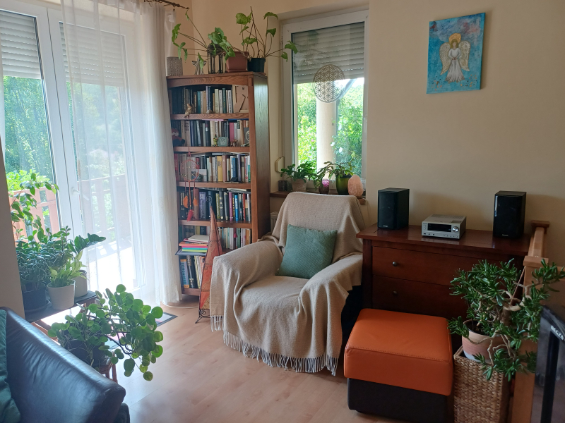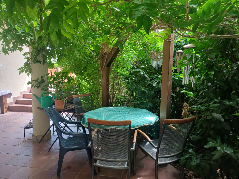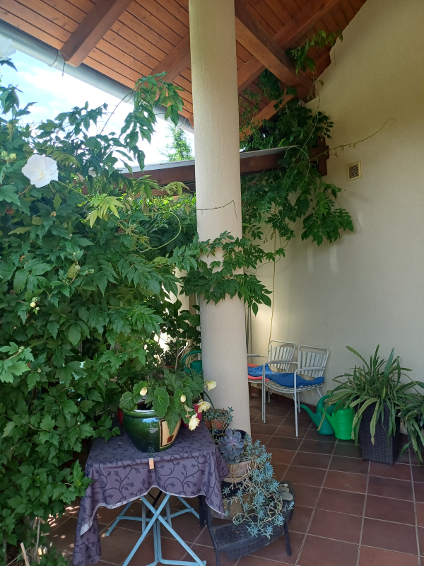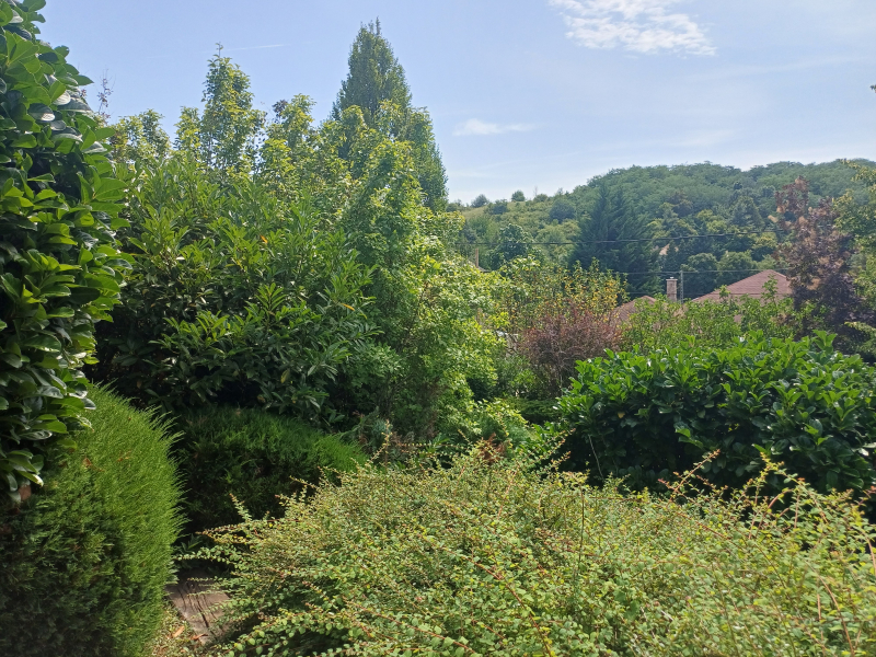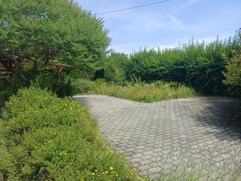 Az egész telek telis-tele van gyönyörű növényekkel (gyertyán, galagonya, ringló, tiszafa, hársfa, ginkgo, füge, cseresznye-, meggyfa, vérszilva, színes virágok, stb. :)). Még gyógynövényes rész is helyett kapott a kertben. Hangulatos kis kiülős részek vannak az érett növényzet között. :)