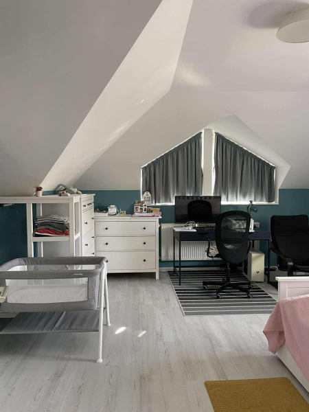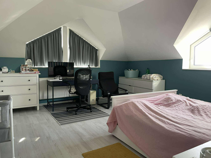 Emelet: három hálószoba, egy dolgozószoba, valamint elegáns fürdőszoba.