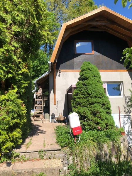 Lakóházzá bővített hétvégi ház az erdő szomszédságában.