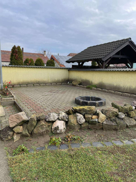 A kert szép gondozott, igaz nem túl nagy, de minden olyan igényt, ami a hétköznapokban komfortot jelent, biztosítja. Gépkocsi beállási lehetőség, kiskert, szalonna sütési lehetőség, kerti kiülő.