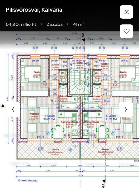 A társasház 4 lakásos: Az emeleten 2 db 41,04 nm-es lakás van 10,98 nm es panorámaterasszal, a földszinten két 50,8 nm-es kertkapcsolatos lakás épül +4,65 nm-es térkövezett terasszal.