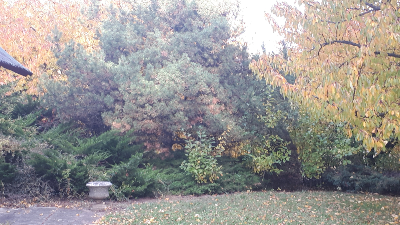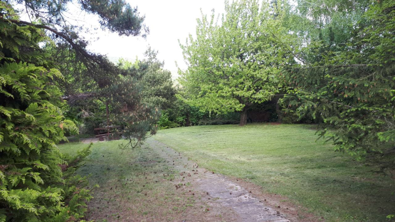 Az egyik telekrész kerített, teraszos, rajta zárt konténerépület, amely egy építkezés alatt is jól hasznosítható. Itt több tíz éves örökzöldek, gyümölcsfák kis szaletli is található.