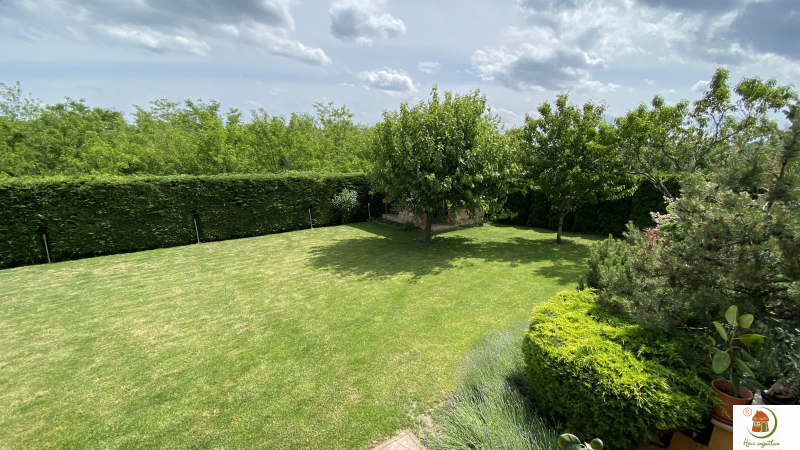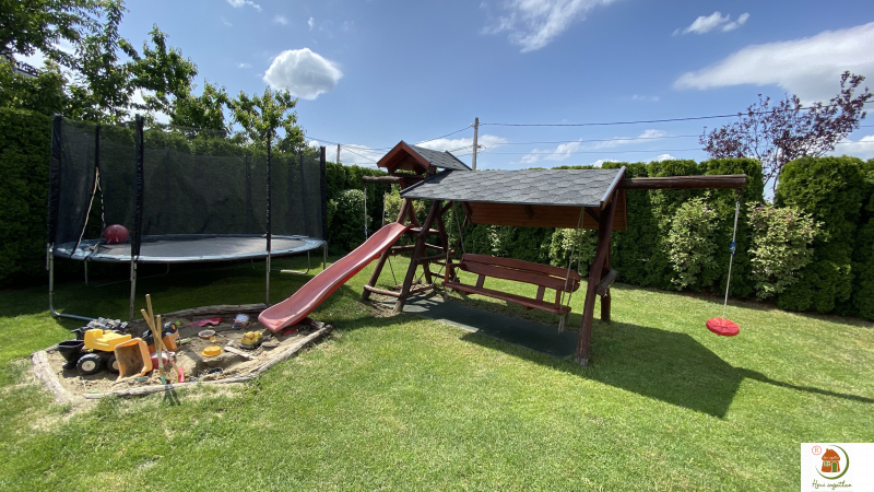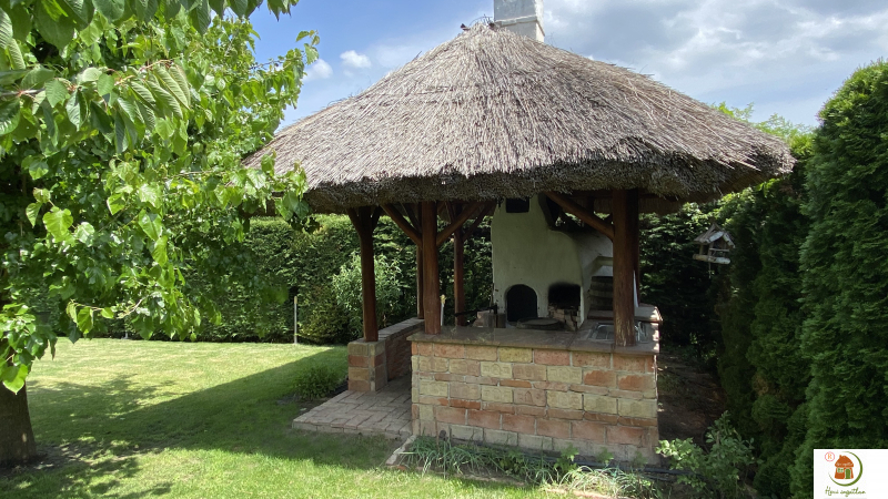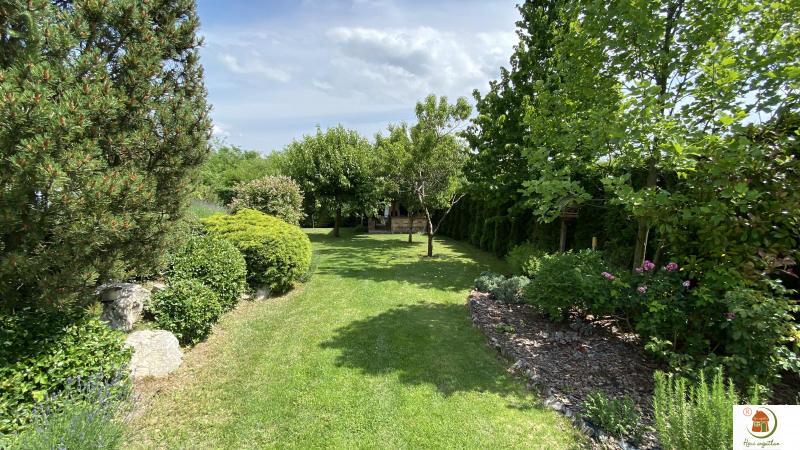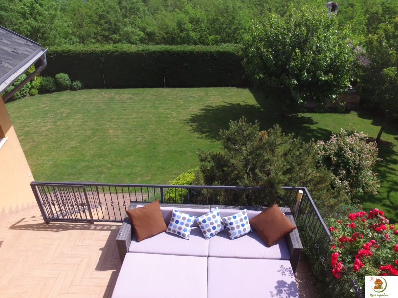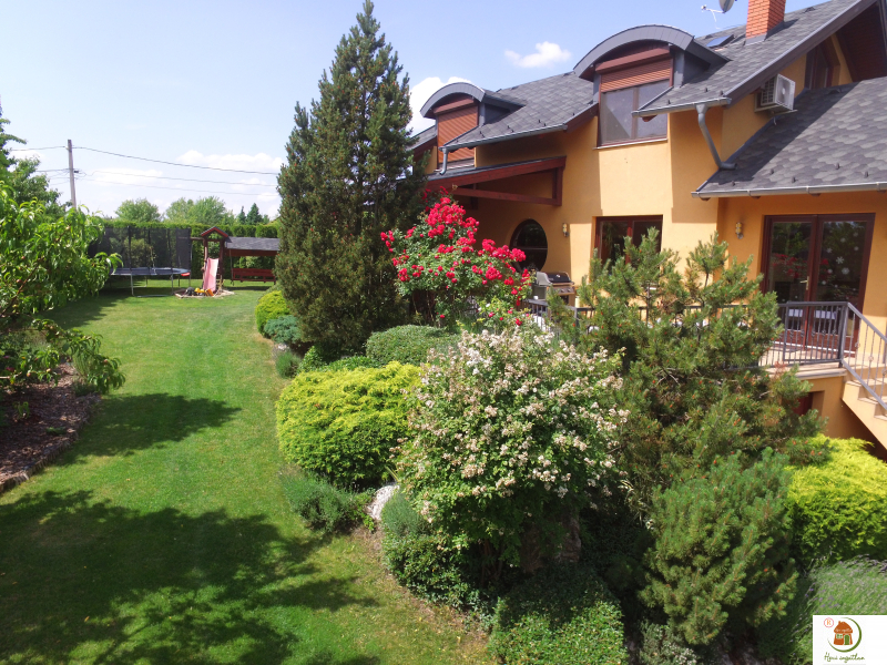 A kert parkosított, játszótérrel és fedett, kerti bulihellyel: búboskemence, nyárikonyha várja a vendégeket. Automata öntözőrendszer és robotfűnyíró gondoskodik a növényekről.