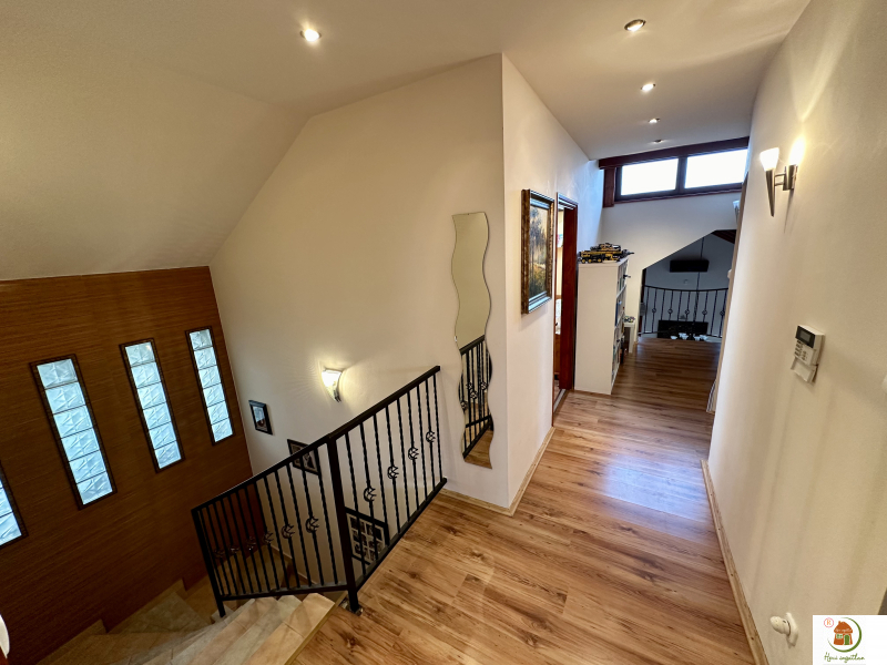 A földszinten kétállásos garázs, előszoba beépített gardróbszekrénnyel, amerikai konyhás nappali galériával, kamra, fürdőszoba, külön wc található. Az emeleten van a három hálószoba és a második fürdő. A kertből is megközelíthető félszuterén szinten egy nagy szoba és a kiszolgáló helyiségek találhatók.