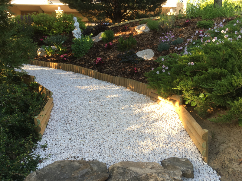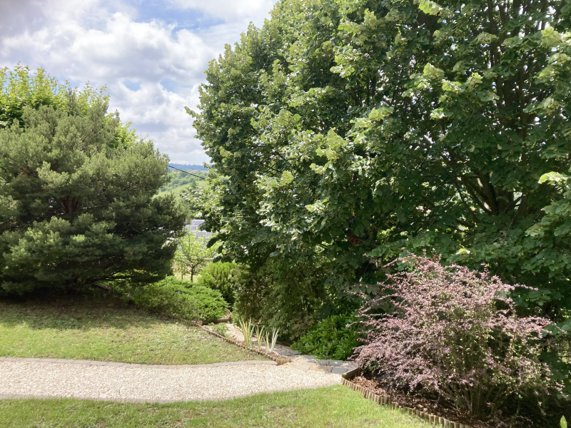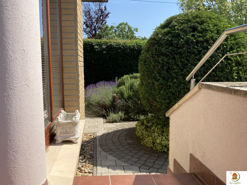A kertépítő által tervezett kert gyönyörűen teraszosított és parkosított, sütögetővel, dísznövényekkel és gyümölcsfákkal, de van hely a medencének is. Öntözőrendszer és kerti csap segíti a kertészkedést.
