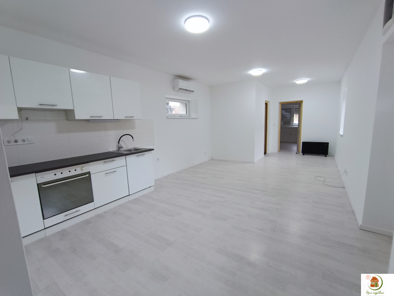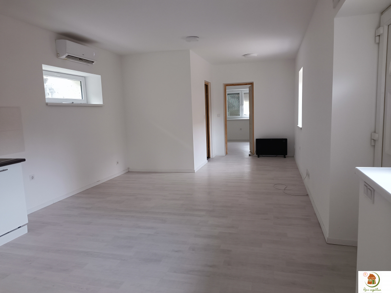 A hosszúkás ház két végén egy-egy jó méretű, jól berendezhető szoba (15,2m² és 11,3m²) van egy-egy fürdőszobával, a ház közepén tágas amerikai konyhás nappalival (28m²), fehér konyhabútorral, Pelgrim villanysütővel, korszerű nyílászárókkal.