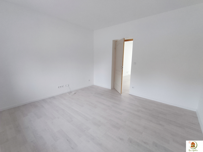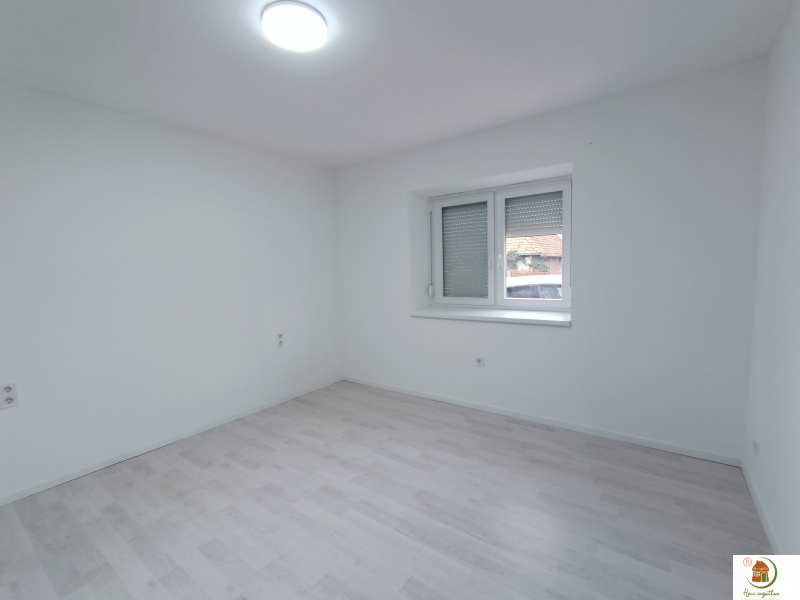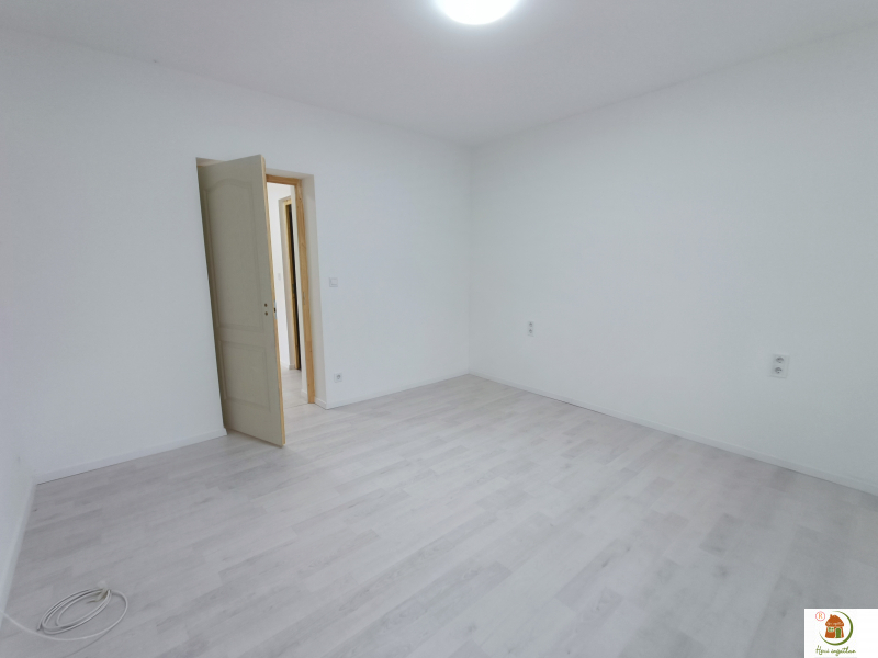 Korszerű, tetszetős világítás, elegáns szürkésfehér laminált parketta, törtfehér színű falak.
