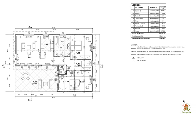 A ház bruttó alapterülete 120 nm, a nettó 103 nm, plusz 38 nm terasz. A tágas ház beosztása:
