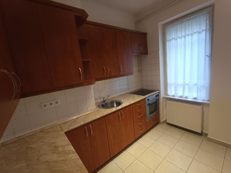 A lakásban beépített konyhabútor van elektromos főzőlappal, sütővel. Igény esetén hűtő, mosógép megoldható. Pincei tároló bérelhető.