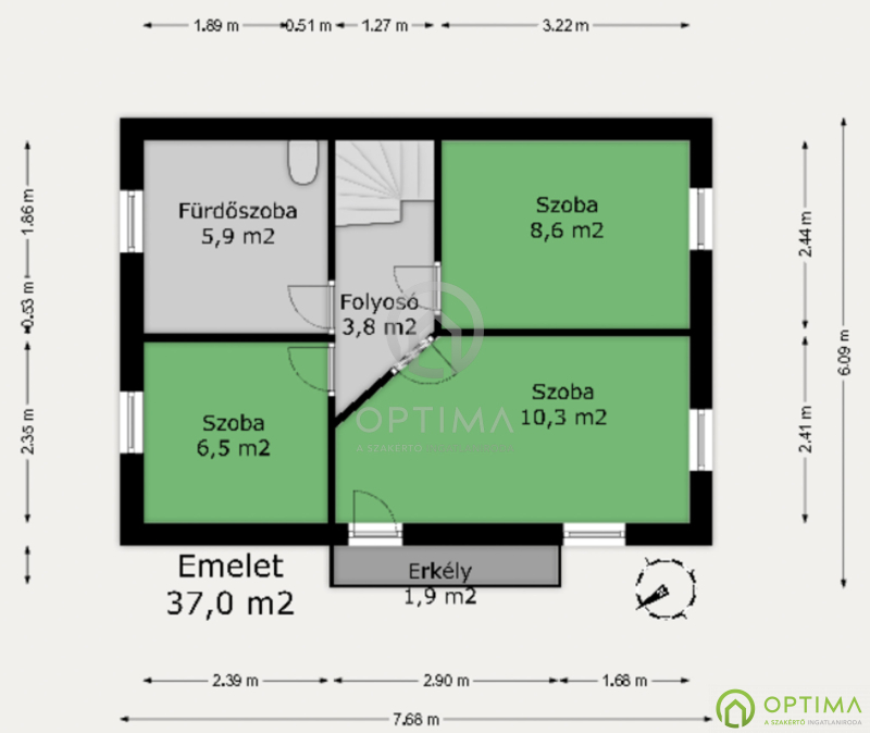 Az emeleten három különnyíló hálószoba található, amelyek közül az egyik saját erkéllyel is rendelkezik. Továbbá szintén ezen a szinten található még egy nagyopn tágas fürdőszoba is egy nagyméretű sarokkáddal.