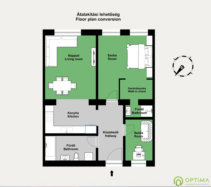 Átalakítási lehetőségek: igény szerint amerikai konyhás nappali alakítható ki, mellette 2 vagy 3 külön nyíló szobával. Befektetési célra 4 külön nyíló szobás, két fürdőszobás, szobánkénti kiadásra optimalizált elrendezés is megvalósítható.