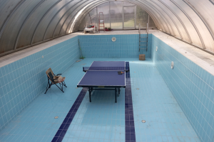 Az alsó szinti lakás teraszáról jutunk közvetlenül a kültéri, bár fedett nagy méretű úszómedencehez.