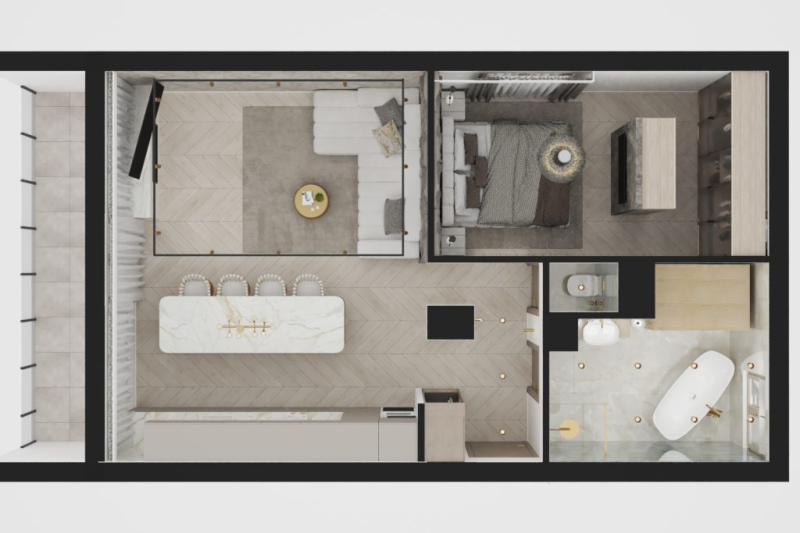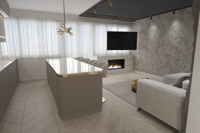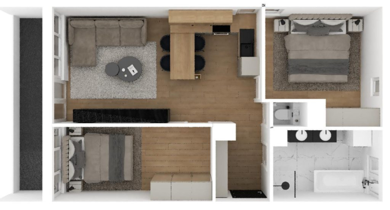Egy amerikai konyhás nappaliból, 2 hálószobából, egy zuhanyzós és kádas fürdőszobából, illetve dolgozó vagy gardrób szobából áll. A felújítás mindenre kiterjed: