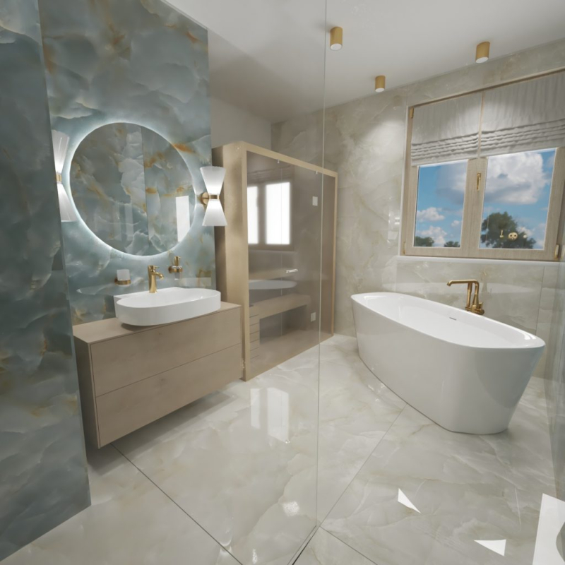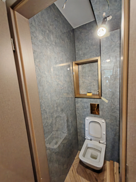 Fürdőszobában walkin zuhanyfal (Hüppe), falsík alatti szerelvények (Grohe termosztátos), falsík alatti wc tartály, mosdószekrény.