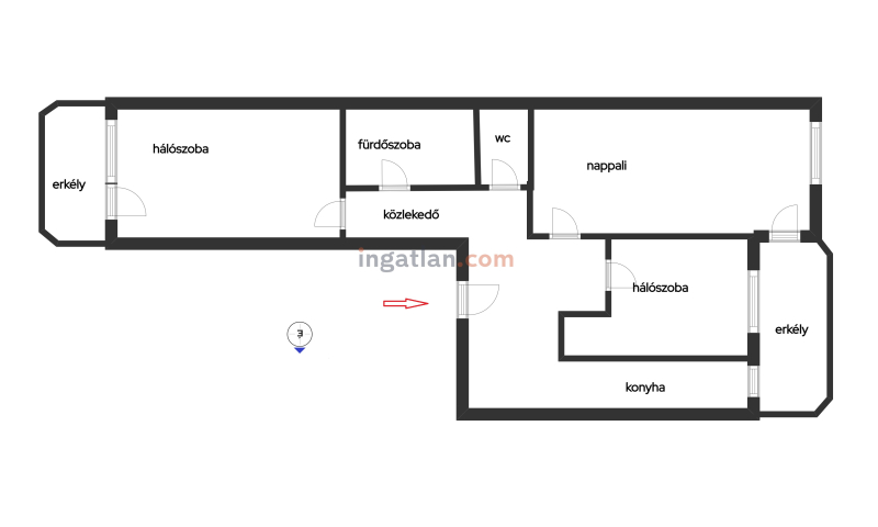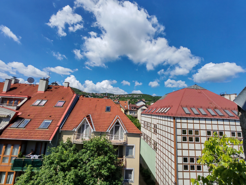 A lakás kelet-nyugati tájolású, erélyei az utcafrontra, és a kertre is néznek.