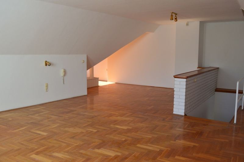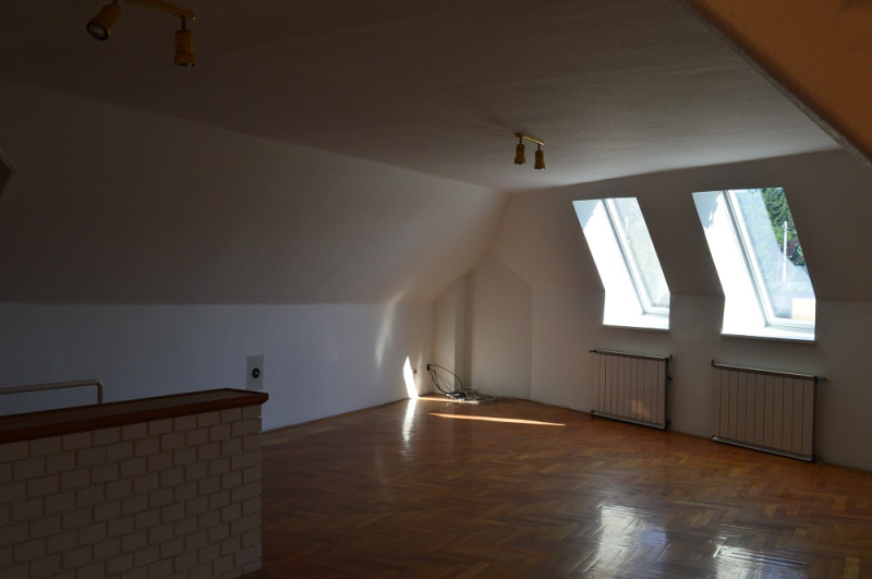 A fölső tetőtéri szint egylégterű, mely praktikusan dolgozónak, vagy gyerekek "játszóterének" is remekül használható.