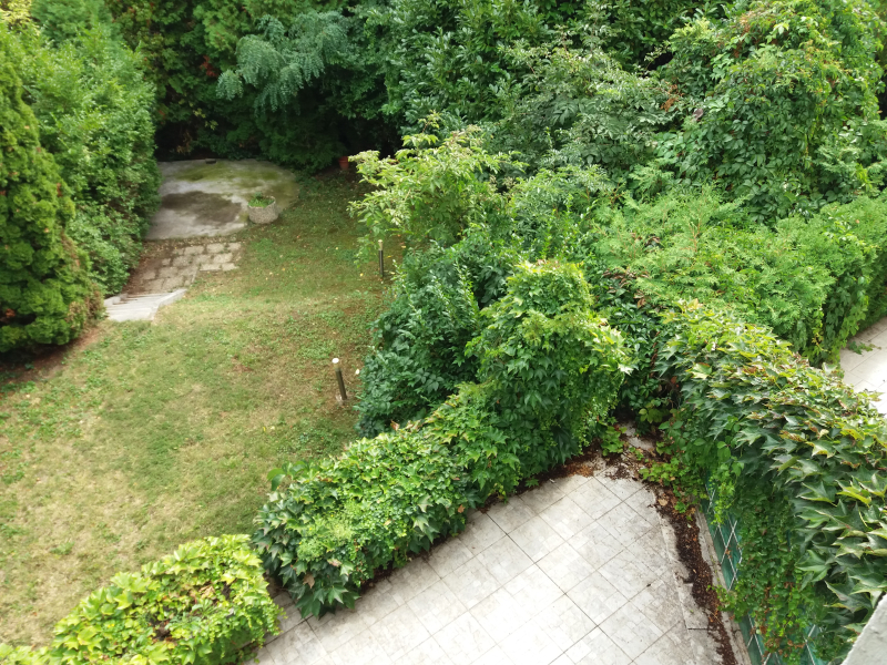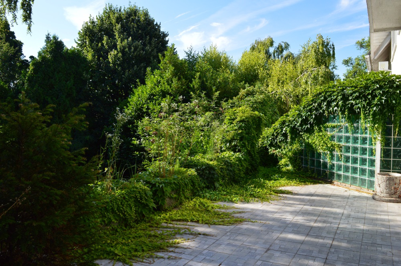 Az alsó szinten a tágas, világos nappaliból közvetlenül egy nagy kertkapcsolatos terasz előnyeit élvezhetjük. A kert több éves fákkal övezett területe teljes intimitást biztosít, ahol egy kerti medence felállítására is alakítottak ki helyet.